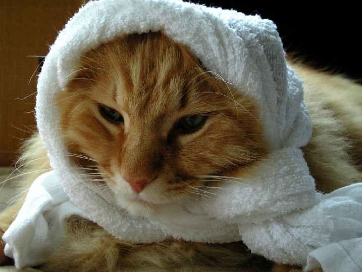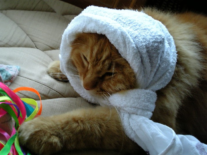 しかし、耳をセロテープで貼り付けられスコティッシュ・フォールドもどきにされようが、ヘアバンドで胴体を挟まれようが、頭にタオルを巻きつけられようが、チャチャ丸君はメゲナイ。
